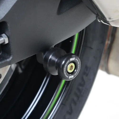 Nice little bobbins for the swingarm. Sleek design with dual function: they ensure that the swingarm is protected and allow the motorcycle to be placed on a paddock stand.