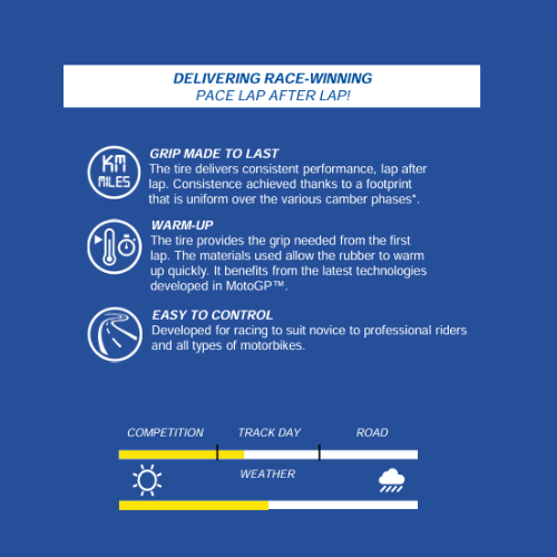 The tyre delivers consistent performance, lap after lap. It provides the necessary grip from the first lap. The materials used ensure that the rubber warms up quickly. It benefits from the latest technologies developed in MotoGP. Designed to easily adapt to novice and experienced riders and to any type of motorcycle.